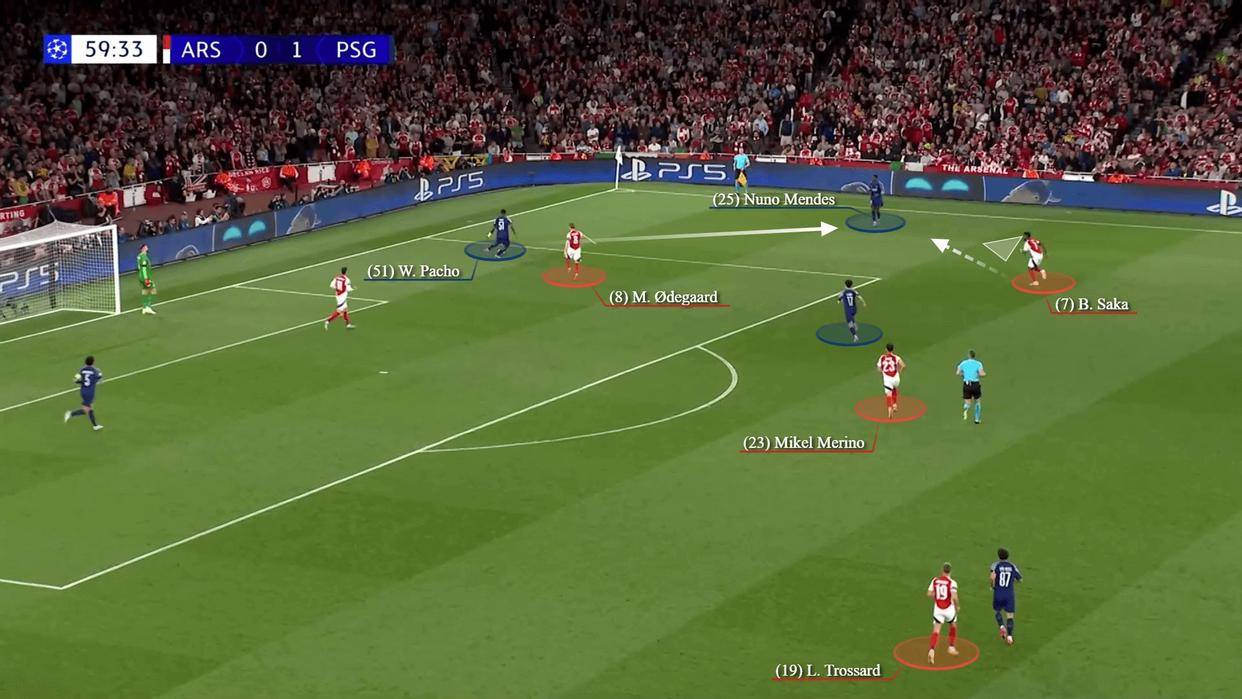 在这一调整的作用下,阿森纳在控球阶段的表现有所提升,但巴黎圣日耳曼在中场之后找到了应对之策。中后卫帕乔在厄德高的逼抢压力下将球传给门德斯。萨卡上前逼抢门德斯,同时也留意着维蒂尼亚的动向。